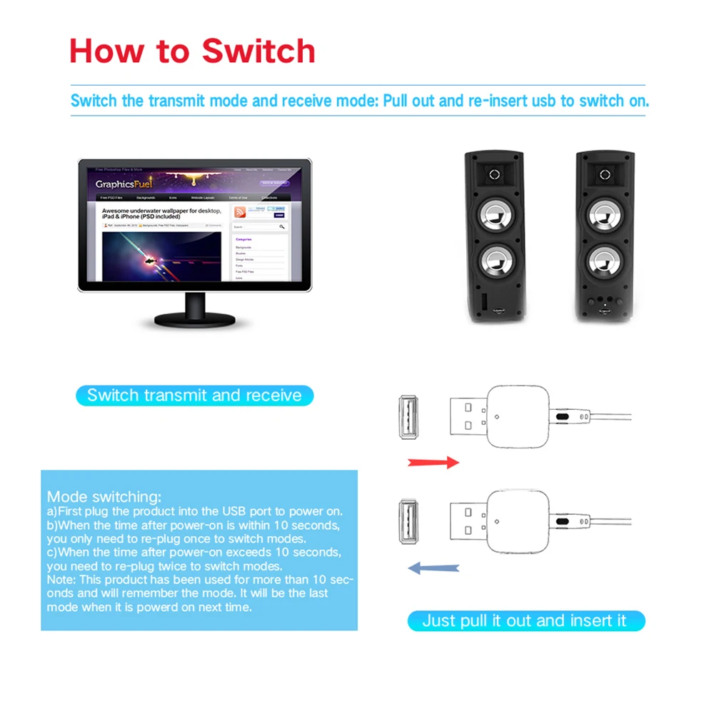 2. Режим передатчика: Беспроводная передача аудио с вашего телевизора без Bluetooth, домашней стереосистемы или CD-плеера на наушники или колонки Bluetooth