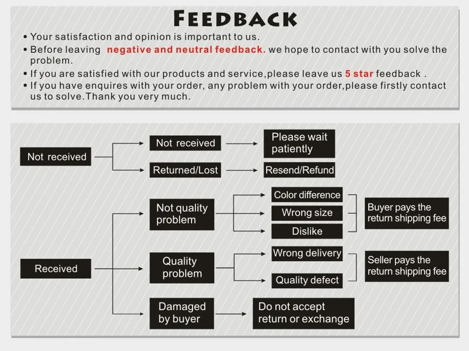 Мы поддерживаем высокие стандарты качества и стремимся к 100% удовлетворенности клиентов! Отзывы покупателей очень важны. Мы просим вас, ПРЕЖДЕ чем оставлять нам нейтральный или отрицательный отзыв, связаться с нами, чтобы мы могли разрешить проблему к общему удовольствию. Невозможно решить проблемы, если мы о них не знаем!