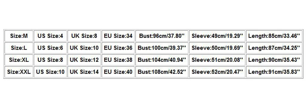 | Размеры: XL | Нам Размеры: 8 | UK Размеры: 12 | ЕС Размеры: 38 | Бюст: 104 см/40,94 дюйма | Рукав: 51 см/20,08 дюйма | Длина: 90 см/35,43 дюйма |