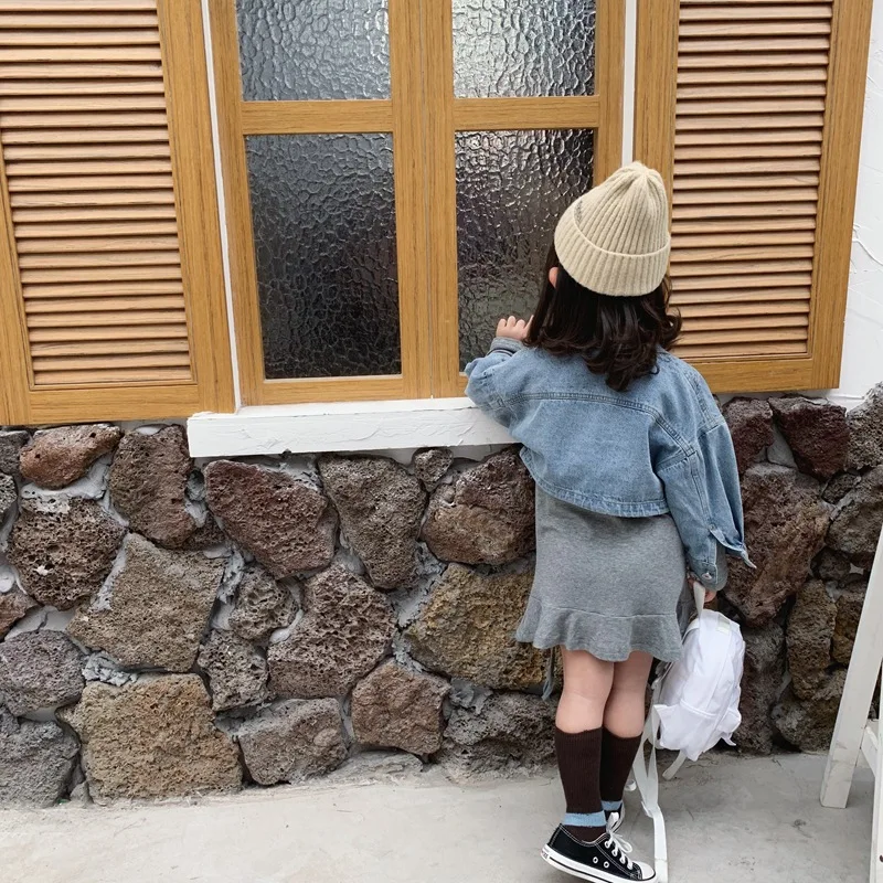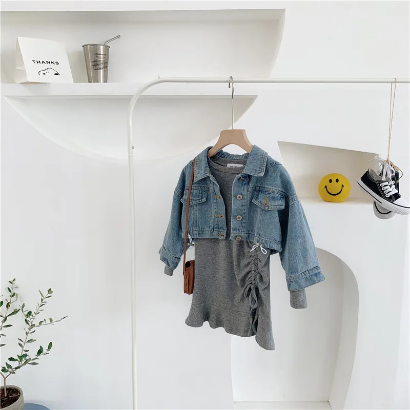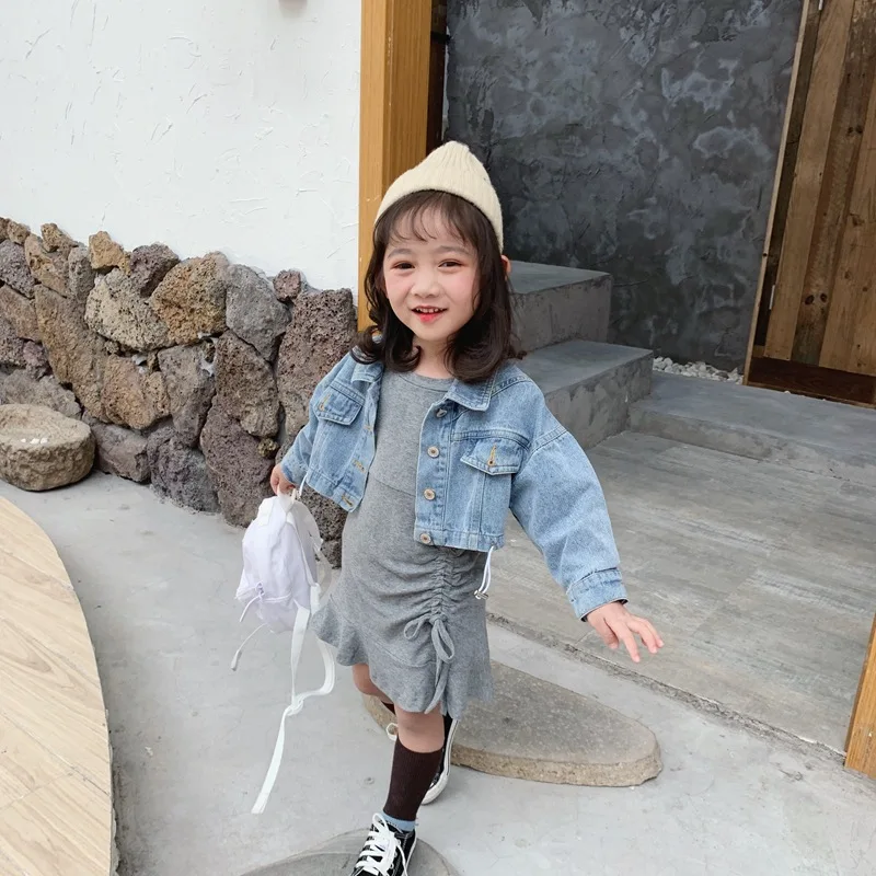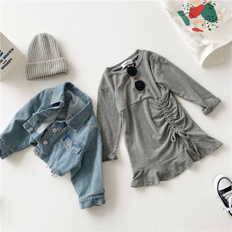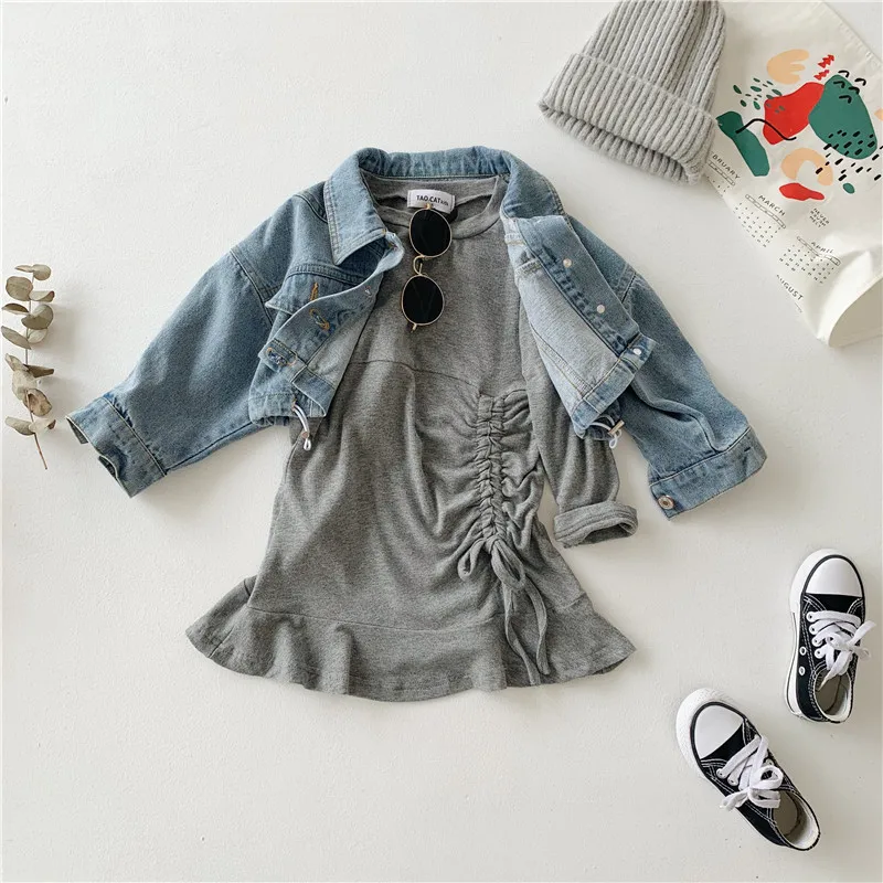 Осенняя Изысканная одежда для маленьких девочек дизайнерское платье с длинными рукавами и рыбий хвост + джинсовая куртка комплект из 2 предметов, детская одежда комплекты детской одежды Состояние на 100% абсолютно новый и высокого качества Материал: хлопок Размер: подходит для детей 2-7 лет