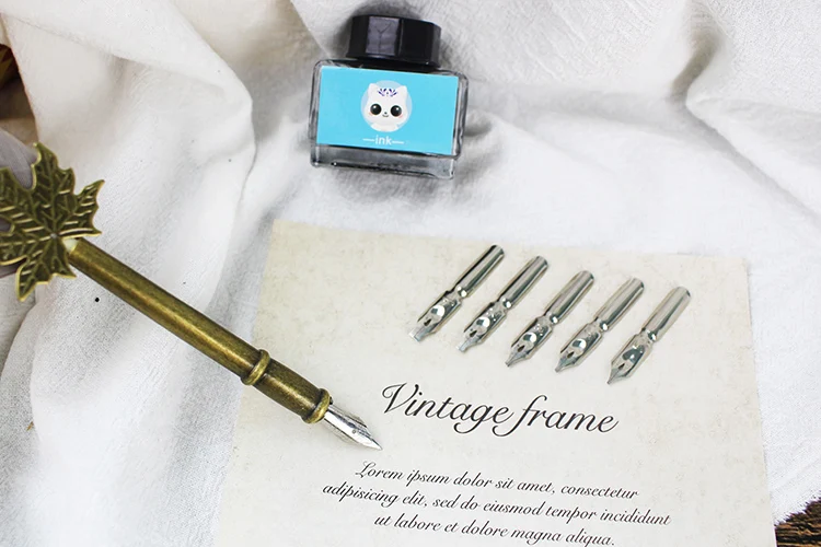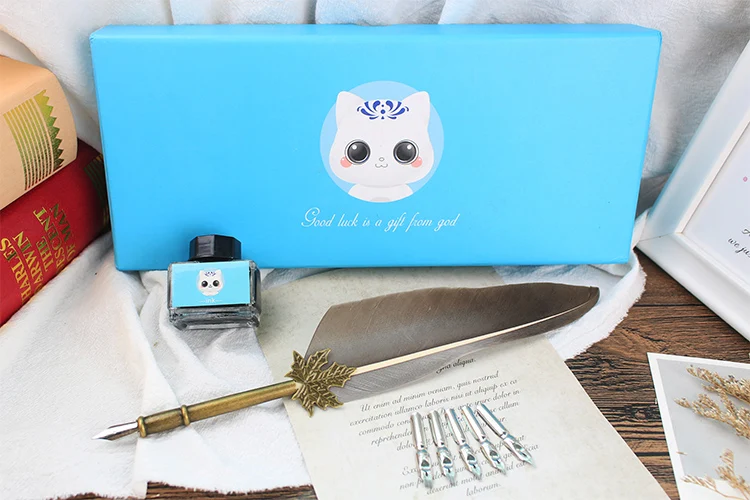 1)Gift box:26cm*13.5cm*4cm 1 set (1pc quill pen + 1pc empty ink bottle + 6pcs nibs + 1pc gift box) 2)Product size:pen length appr.25cm