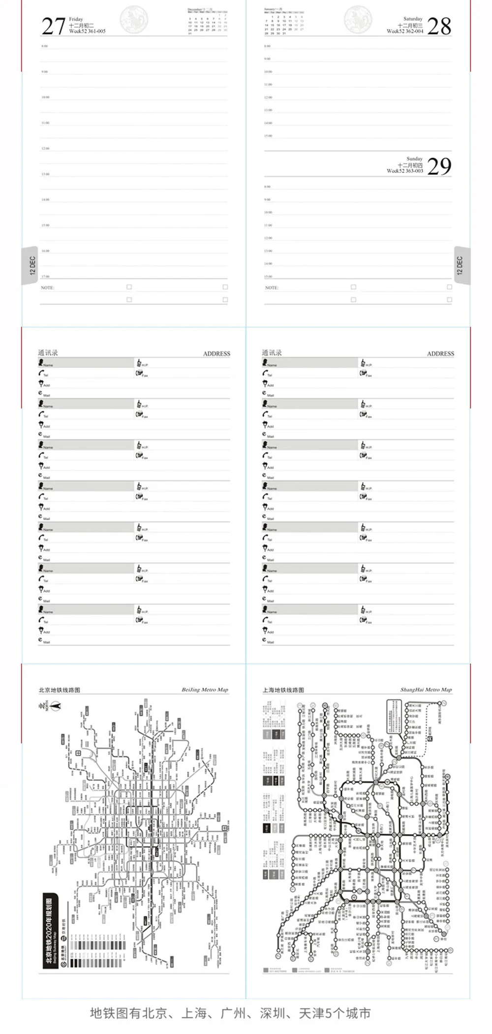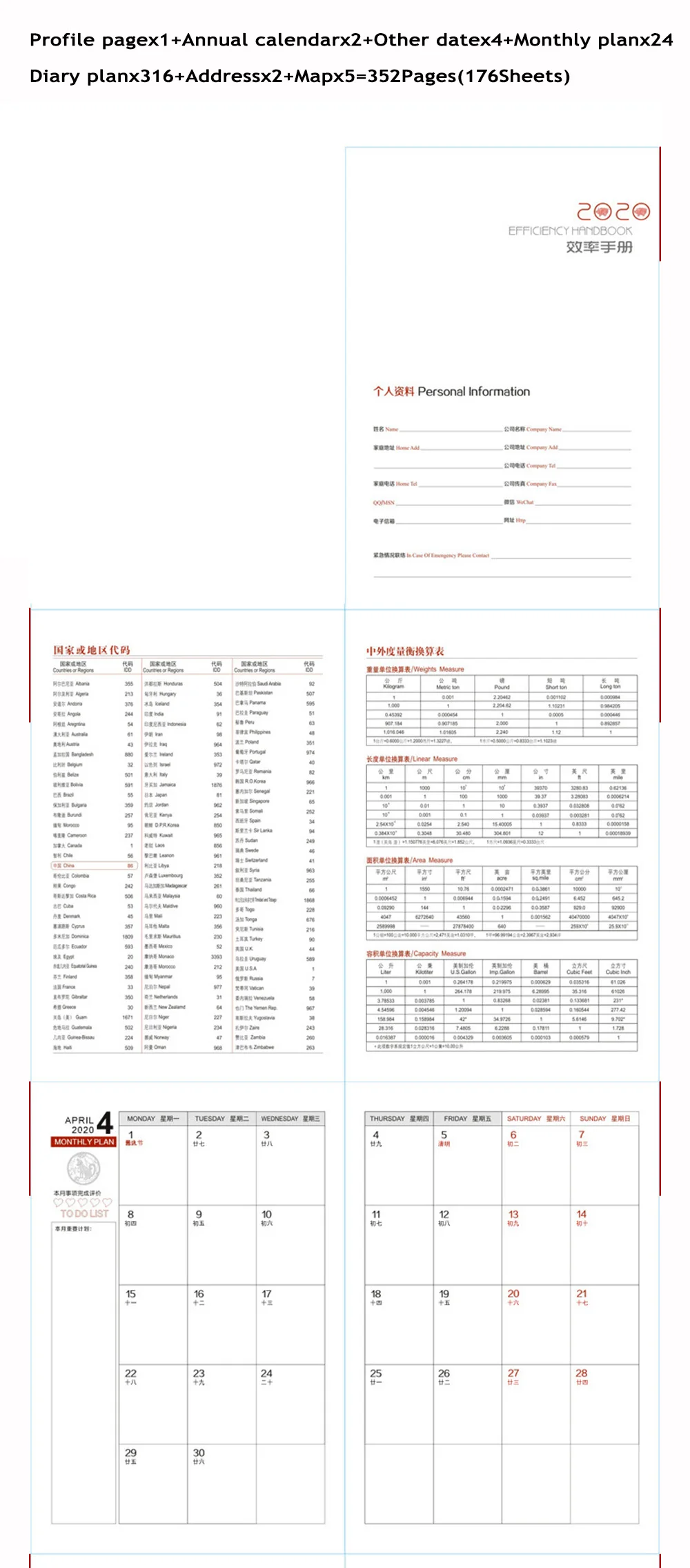 Профиль pagex1 + годовой календарь x2 + другие данные 4 + ежемесячный планx24 + дневник планx316 + адресс x2 + Mapx5 = 352 страниц (176 листов)
