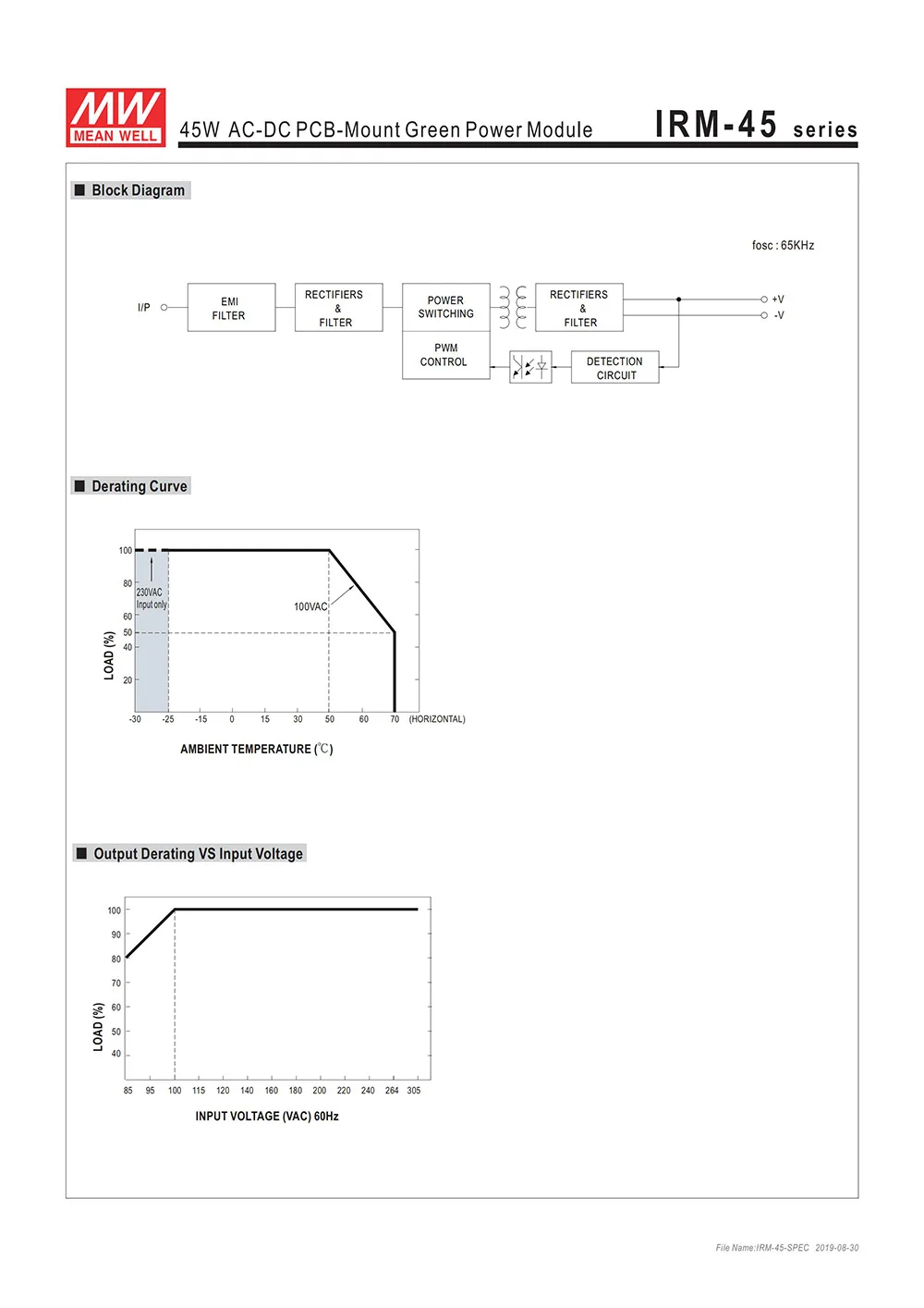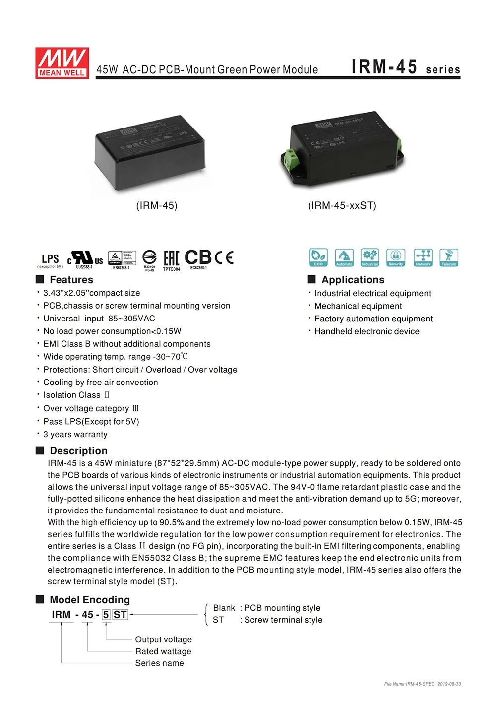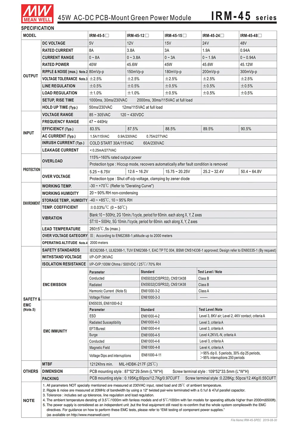 IRM-45 45 Вт миниатюрный (87*52*29,5 мм) AC-DC Блок питания типа модуля, готовый к паять на печатные платы различных видов электронных инструментов или оборудования промышленной автоматизации. Этот продукт обеспечивает Универсальный Диапазон входного напряжения 85 ~ 305VAC. Огнестойкий пластиковый чехол 94V-0 и полностью очищенный силикон повышают теплоотдачу и отвечают требованиям анти-вибрации до 5G; Кроме того, он обеспечивает фундаментальное сопротивление пыли и влаги. С высокой эффективностью до 90.5% и очень низкий на холостом ходу, оборот в минуту (потребеление энергии ниже 0,15 Вт, IRM-45 серии выполняет во всем мире правилам для низкая потребеление энергии требование для электроники. Вся серия представляет собой классическую конструкцию (без FG pin), включающую встроенные компоненты фильтрации EMI, что обеспечивает соответствие стандарту EN55032 класса B; характеристики supreme EMC защищают конечные электронные устройства от электромагнитных помех. В дополнение к модели монтажа печатной платы, серия IRM-45 также предлагает модель терминала (ST).