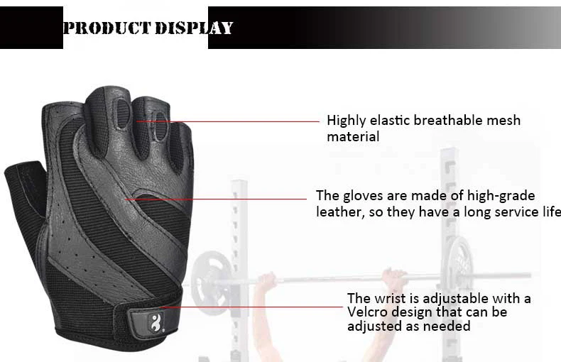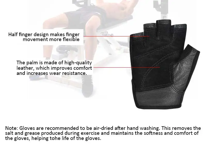 Название: полупальцевые Перчатки для фитнеса Материал: дышащая сетка, свиная кожа Цвет: черный Размеры: S, M, L, XL, XXL Подходящие варианты: стрельба, футбол, настольный теннис, теннис Особенности: 1. Перчатки из высокоэластичного и дышащего сетчатого материала 2. Улучшенные кожаные материалы увеличивают срок службы перчаток 3. На запястье используется регулируемая лента на липучке, которую можно регулировать в соответствии с требованием 4. Для улучшения комфорта и износостойкости ладони Используется прочная кожа.