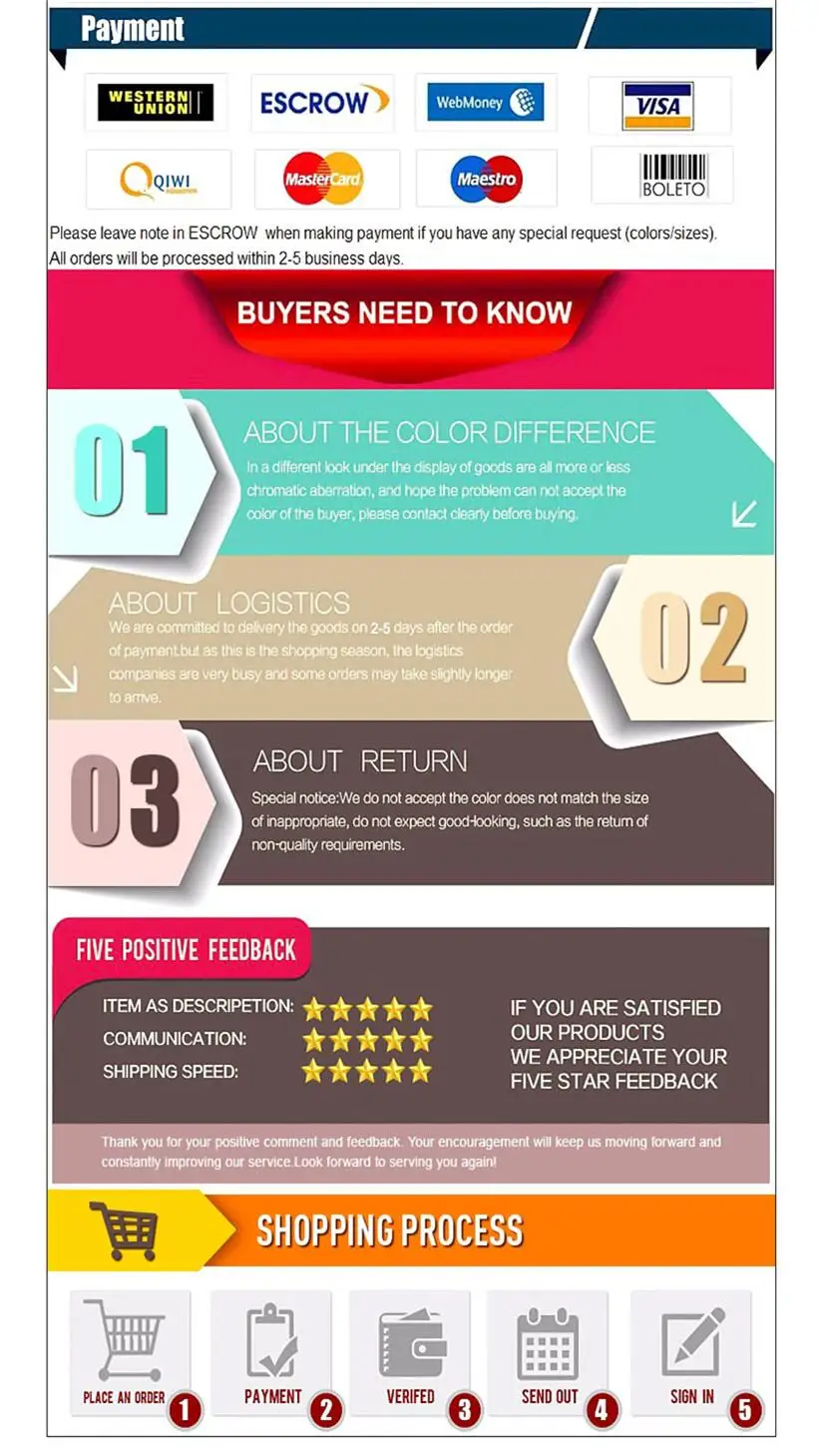 About delivery We will place an order within 5 business days and provide a tracking number. Delivery time varies according to the actual country or region and will be affected. Due to weather, public holidays and other factors, if you do not receive the goods within the reporting time, please contact us in time. About parcels To protect your privacy, we guarantee that your products are delivered under safe conditions. About warranty If the item does not match the description, we will refund the full amount. What if I have a product problem? Please use the product correctly according to the instructions. If there is no effect, please contact sales customer service. Please do not arbitrarily disclose the dispute. We believe that communication and communication are much better than controversy. About working hours Due to the time difference, the communication will be delayed, but the message will be answered within 2 days, please be patient. The customer is our God, we will serve the buyer sincerely and provide you with a more comfortable shopping experience. Your support is very important to us, please don't forget to give us a five-star rating. If you have any other inquiries, you can contact customer service or click on the buyer's help. //helppage.aliexpress.com/buyercenter/index.htm