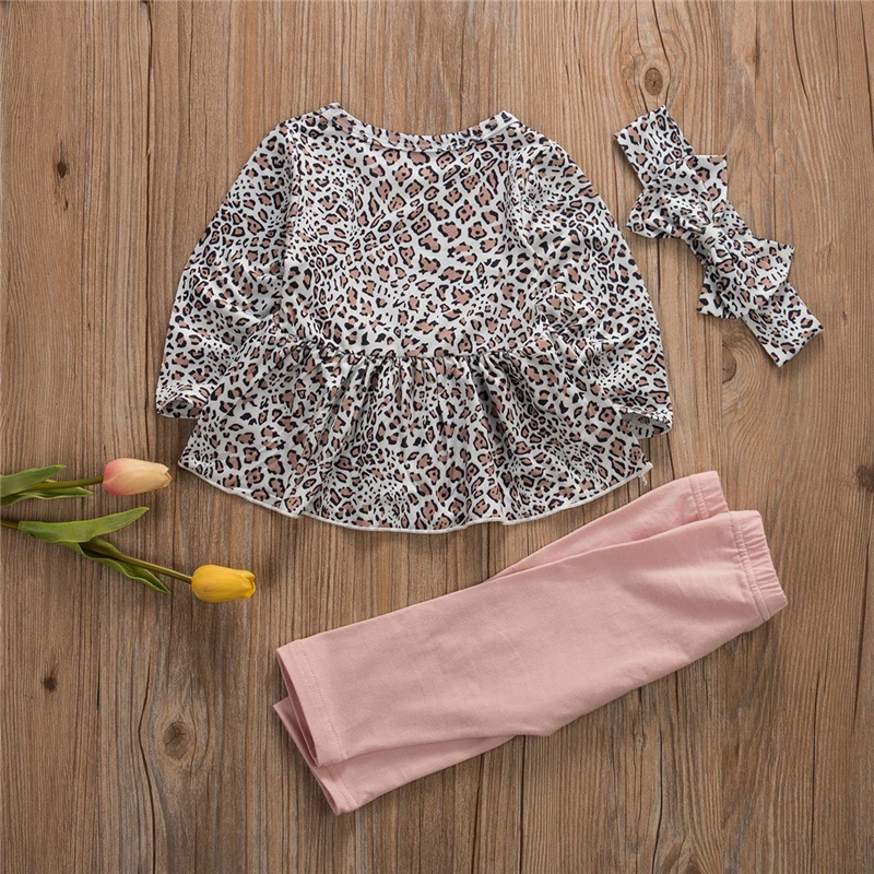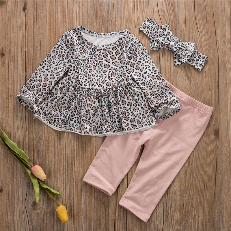 Топы с леопардовым принтом для новорожденных девочек, платье, штаны, леггинсы повязка на голову, комплект одежды из 3 предметов, модная осенняя одежда От 0 до 4 лет для девочек