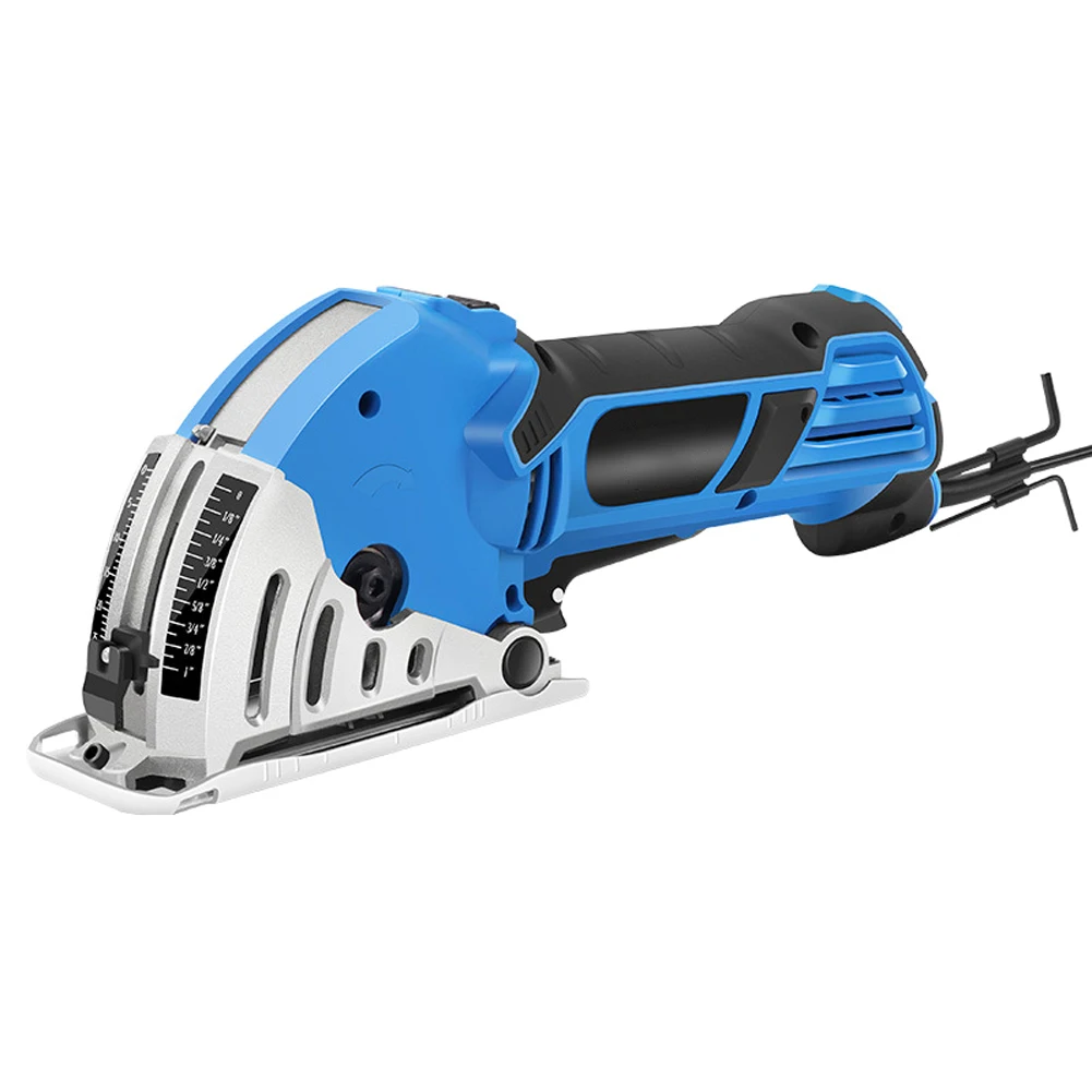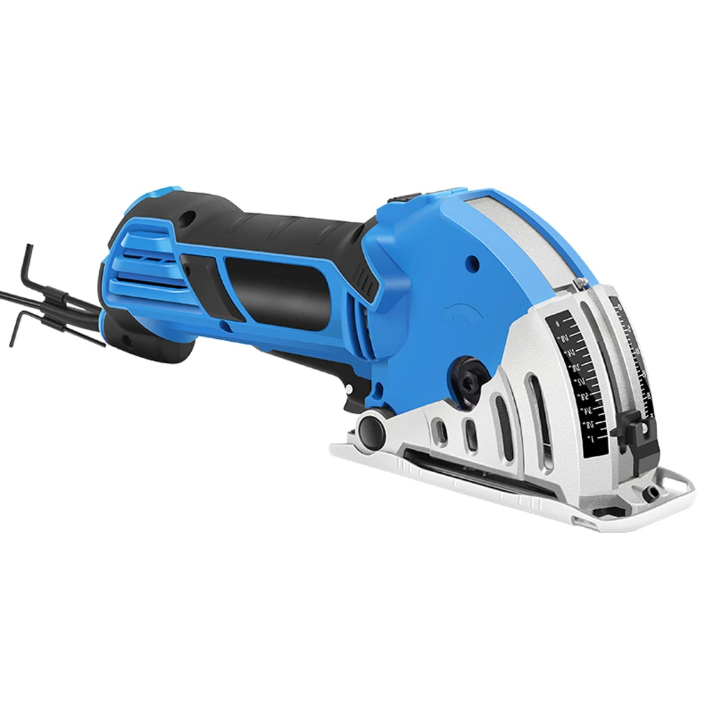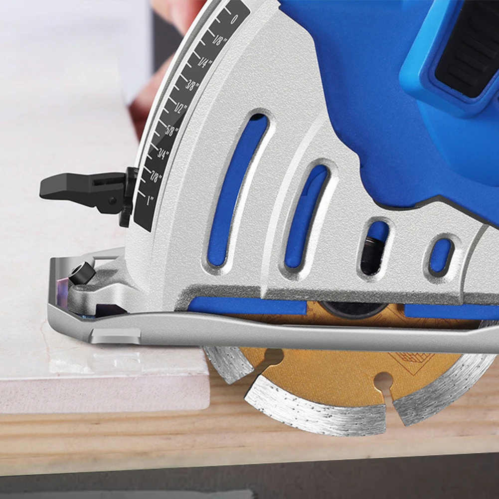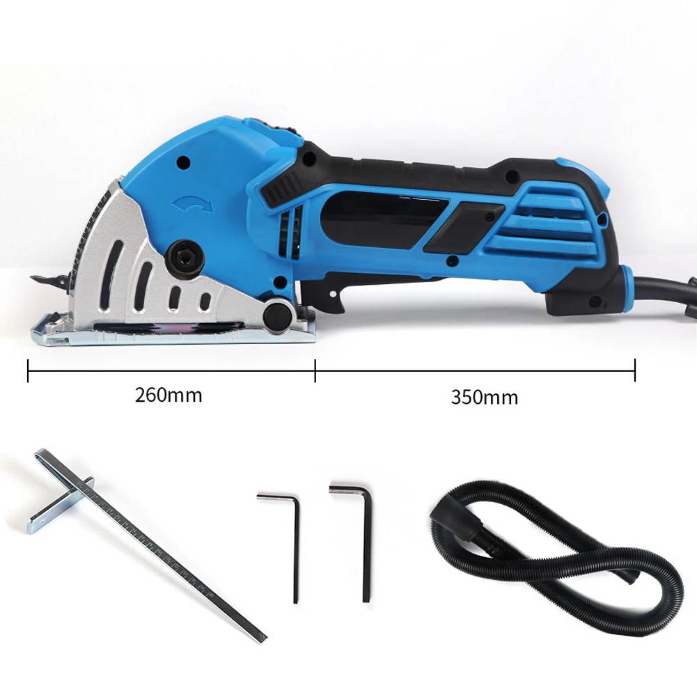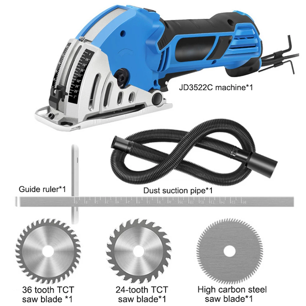 -Он может быть оснащен 5 видами пильных лезвий для резки и снятия фаски деревообрабатывающей доски, водопроводных труб из электрического алюминиевого сплава, каменной плитки, мрамора, керамики, украшения металлических стальных стержней, армированного стекловолокном пластика, печатная плата акриловая пластина и другие материалы.