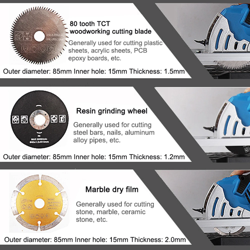 Размер пильного диска: внутреннее отверстие Φ15 мм внешний диаметр Φ: 85 мм