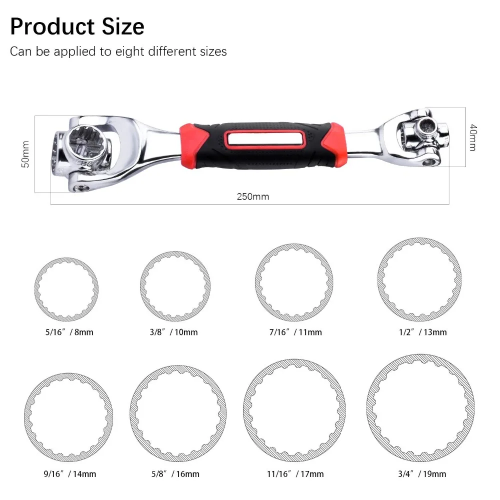 5. Этот инструмент профессионального класса спроектирован с поворотом на 360 градусов и быстро меняет нужный вам размер. Больше никаких усилий, чтобы найти головку розетки нужного размера! Больше не таскать вокруг тяжелых ящиков для инструментов. С этим одним ключом, возьмите догадки из ваших проектов и сделать их быстрее и проще!