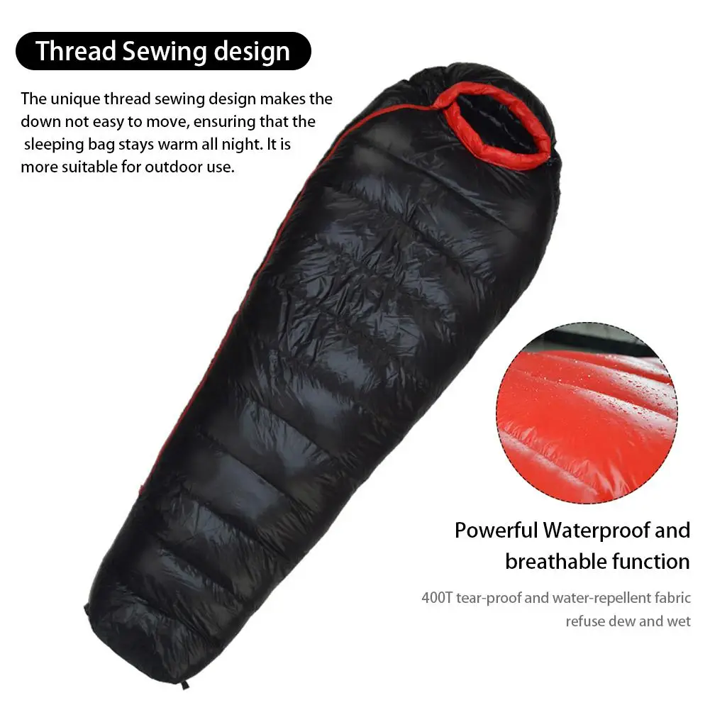 5. Уникальная нить шитья: спальный мешок имеет уникальный дизайн швейной нити, так что перья не легко перемещать, гарантируя, что спальный мешок будет теплым всю ночь. Больше подходит для использования на улице.