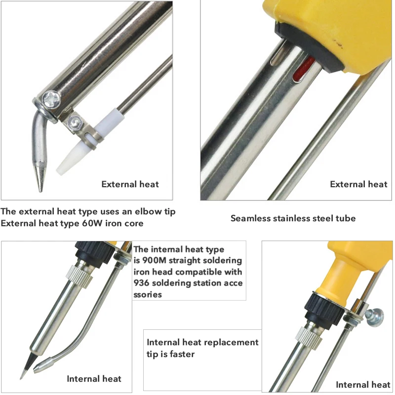 2. Паяльник: внешняя/Внутренняя нагреваемая керамическая технология позволяет паяльнику мощностью 60 Вт быстро нагреваться, что обеспечивает более длительный срок службы и быстрый нагрев.