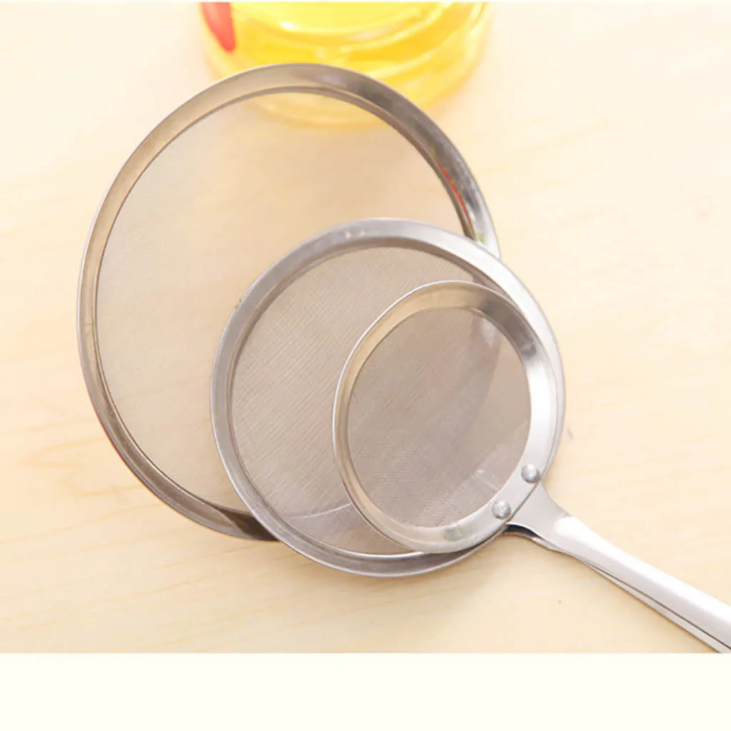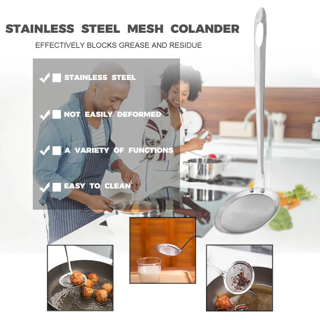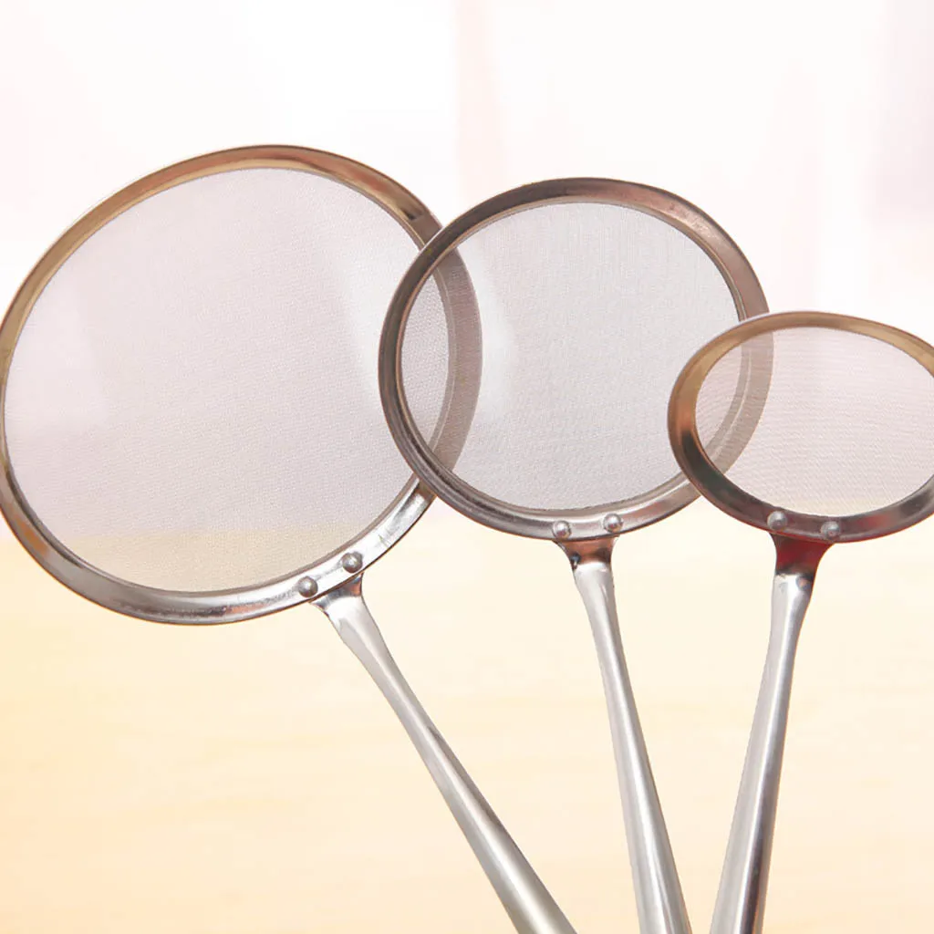Fine mesh strainer: Can be used for separation of the floating fat, grease, foam or scum from the hot pot, soup, soybean milk, juice or something like these easily.Scooping up the bits of panko breadcrumbs when deep frying; DE-greasing breakfast sausages after boiling and frying; Taking out vegetables from water without using a colander etc.