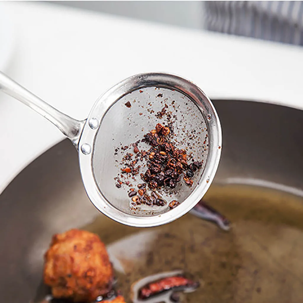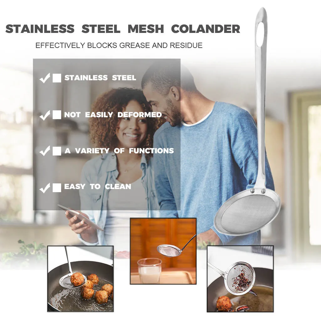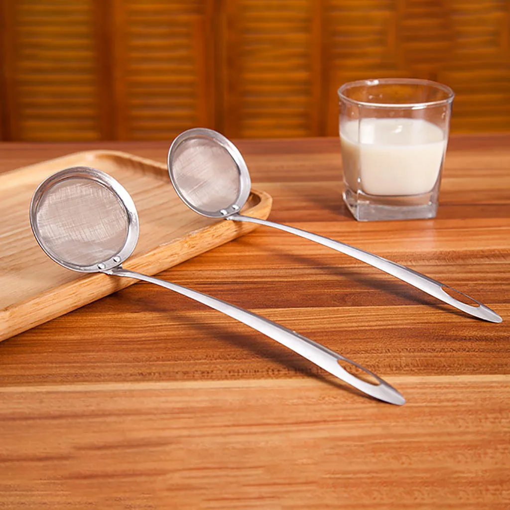 Fine mesh strainer: Can be used for separation of the floating fat, grease, foam or scum from the hot pot, soup, soybean milk, juice or something like these easily.Scooping up the bits of panko breadcrumbs when deep frying; DE-greasing breakfast sausages after boiling and frying; Taking out vegetables from water without using a colander etc.