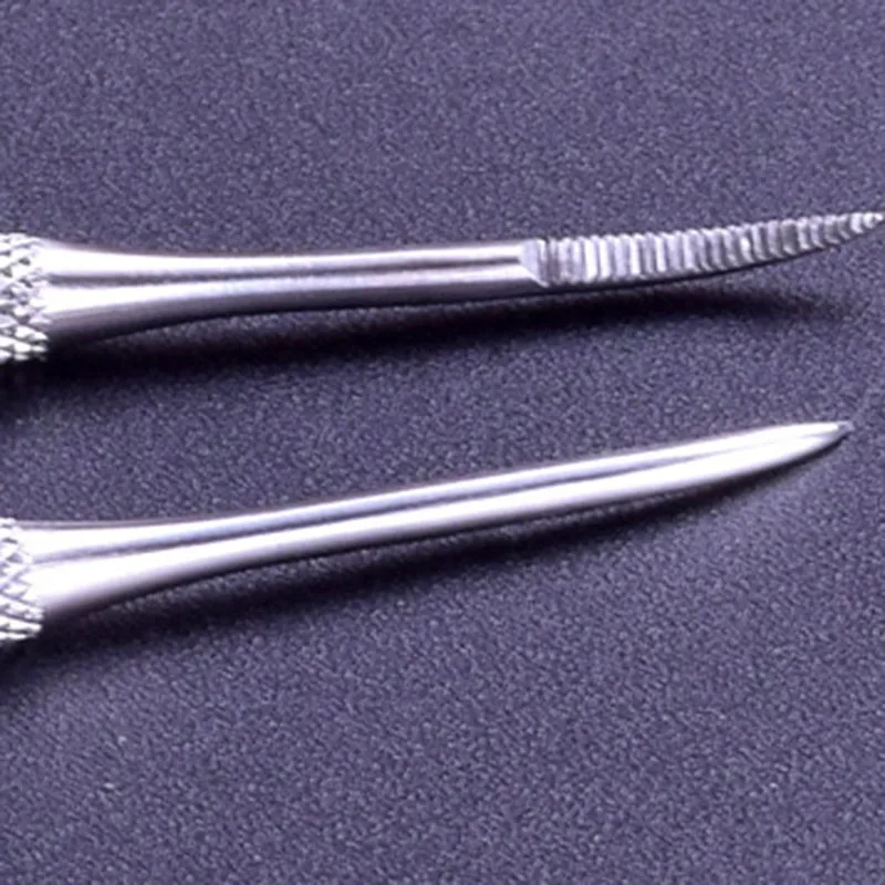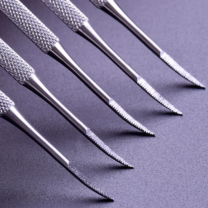 Двухсторонний инструмент из нержавеющей стали, угловые боковые приподнимают ногти вдали от кожи и другие вспомогательные средства для шпателя в антисептическом креме под ногтями.