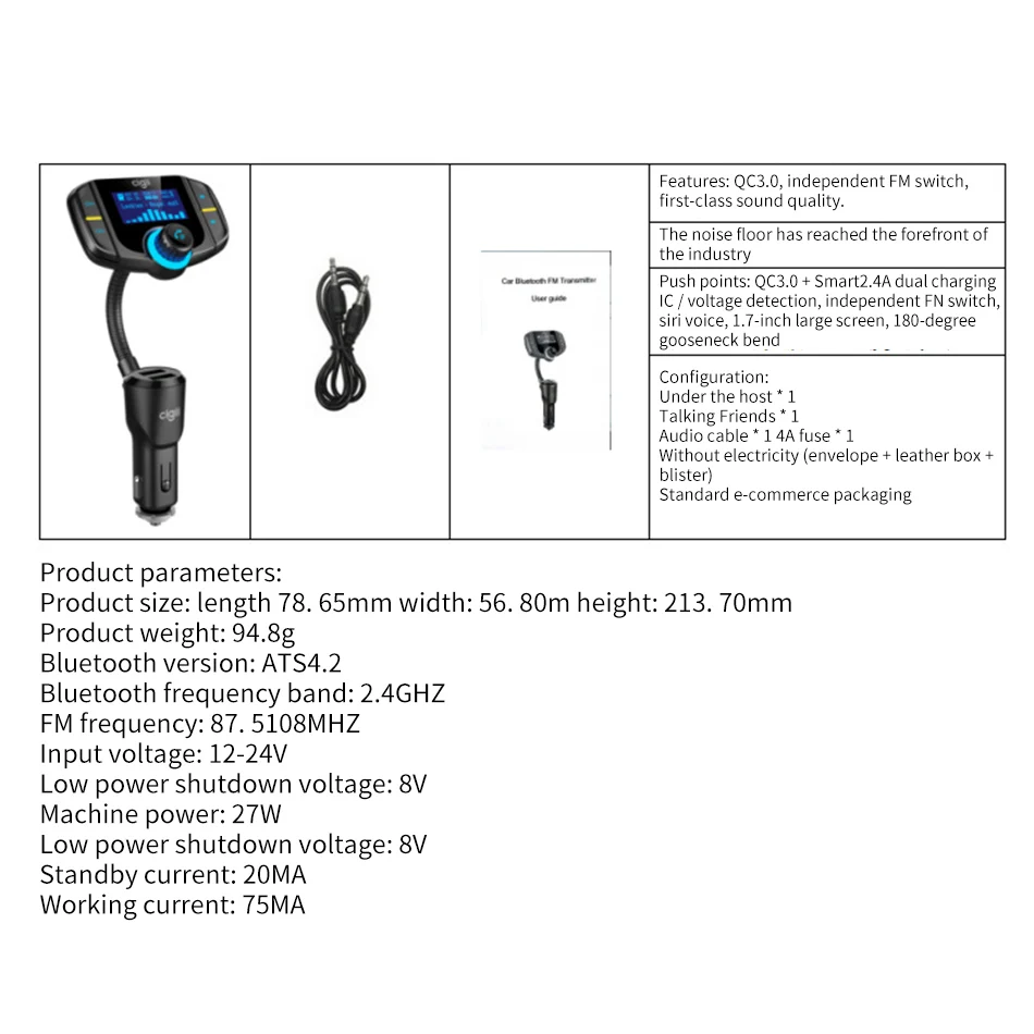 Параметры продукта: Размер изделия: длина 78. Ширина 65 мм: 56. Высота 80 м: 213. 70 мм Вес изделия: 94,8 г Версия Bluetooth: ATS4.2 Bluetooth Диапазон частот: 2,4 ГГц FM частота: 87. 5108 МГц Входное напряжение: 12-24 В Низкое напряжение отключения питания: 8 в Мощность машины: 27 Вт Низкое напряжение отключения питания: 8 в Ток в режиме ожидания: 20 мА Рабочий ток: 75 мА 78. 65*56. 80*213. 70 мм