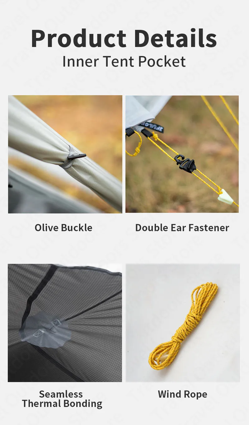 Аксессуары: Внешняя палатка * 1 + Внутренняя палатка * 1 + 2 мм отражающая ветровая веревка * 4 + молотый гвоздь * 9 + горячая посадка патч * 2/молотый мешок для хранения ногтей