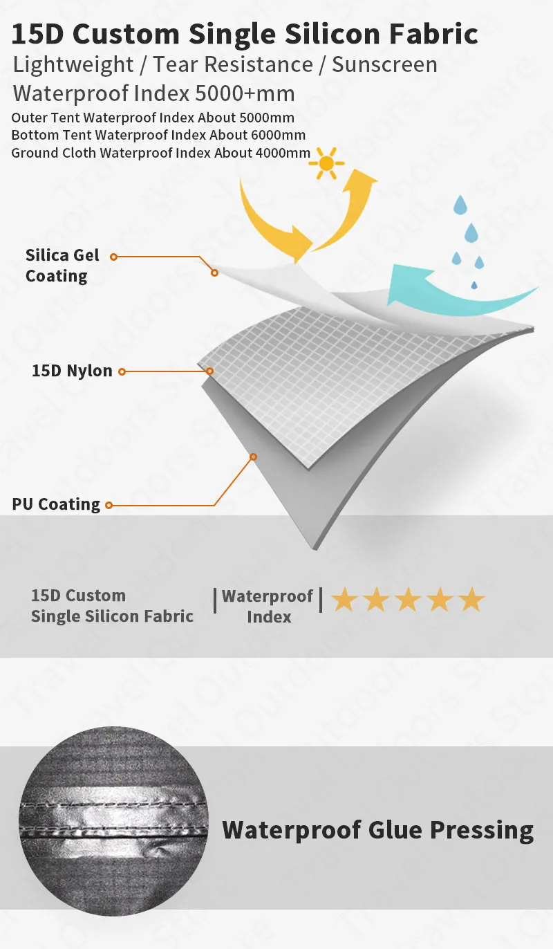 Нижняя палатка: 15D легкий Силиконовый водонепроницаемый нейлон (водонепроницаемый индекс 6000 мм)