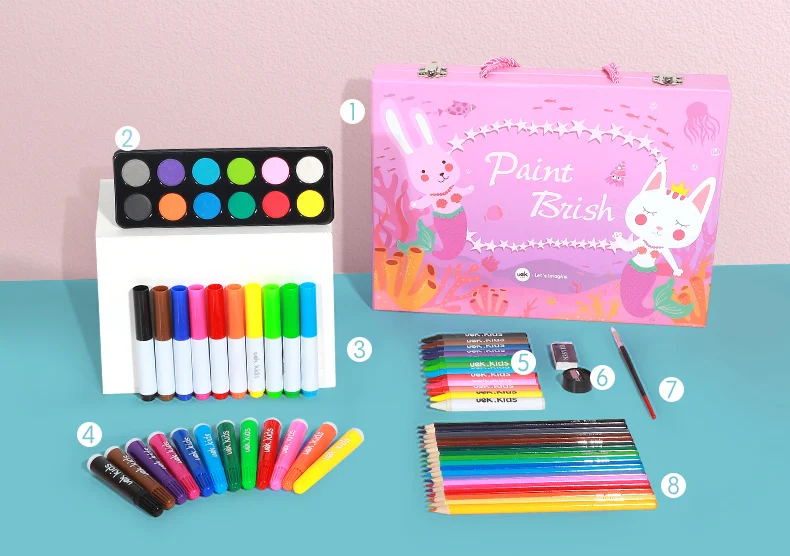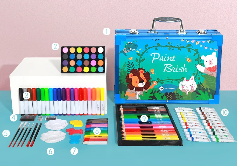 1. 1 pcs Portable Aluminum box 2. 24pcs water colour points 3. 20pcs Maker pens 4. 1pcs Eraser, 1pcs sharpener,1 pcs Plastic Rubber 5. 4pcs brush and 2 HB penicl 6. 2pcs Palette 7. 3pcs Animal crayon 8. 16pcs Oil Pastels 9. 28pcs colour pencil 10. 24pcs watercolours