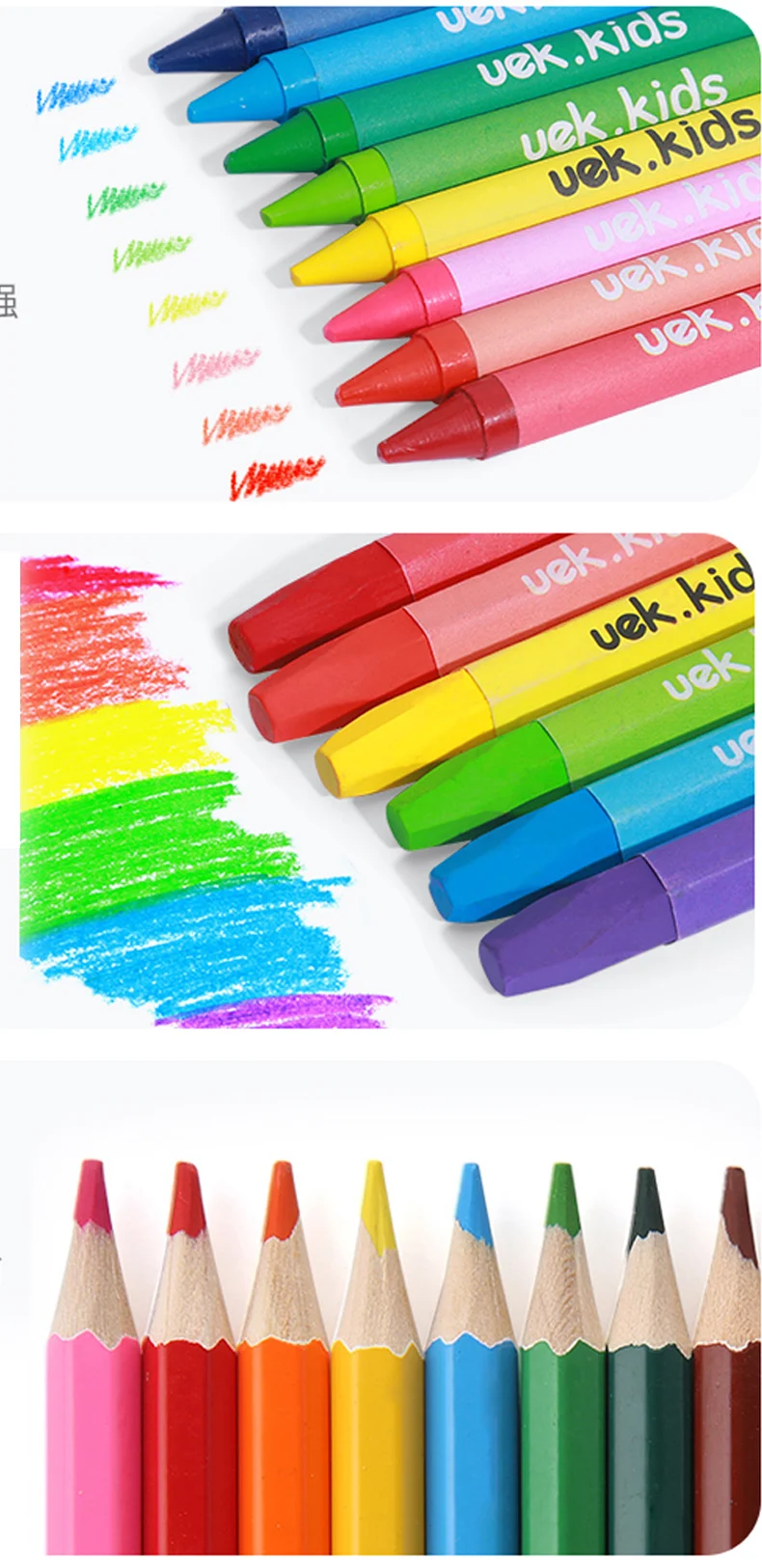 1. 1 pcs Portablecarton box 2. 12pcs water colour points 3. 10pcs Maker pens 4. 12pcs Maker pens 5. 12pcs Oil Pastels 6. 1pcs Eraser, 1pcs sharpener 7. 1pcs brush 8. 18pcs colour pencil