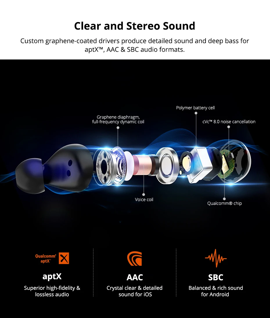 Изготовленные на заказ Драйверы с графеновым покрытием производят детальный звук и глубокий бас в то время как aptX™ для прослушивания звука без искажений. AptX™: превосходное качество и аудио без потерь. AAC: кристально чистый и детальный звук для iOS. SBC: Хорошо сбалансированный и насыщенный звук для Android.