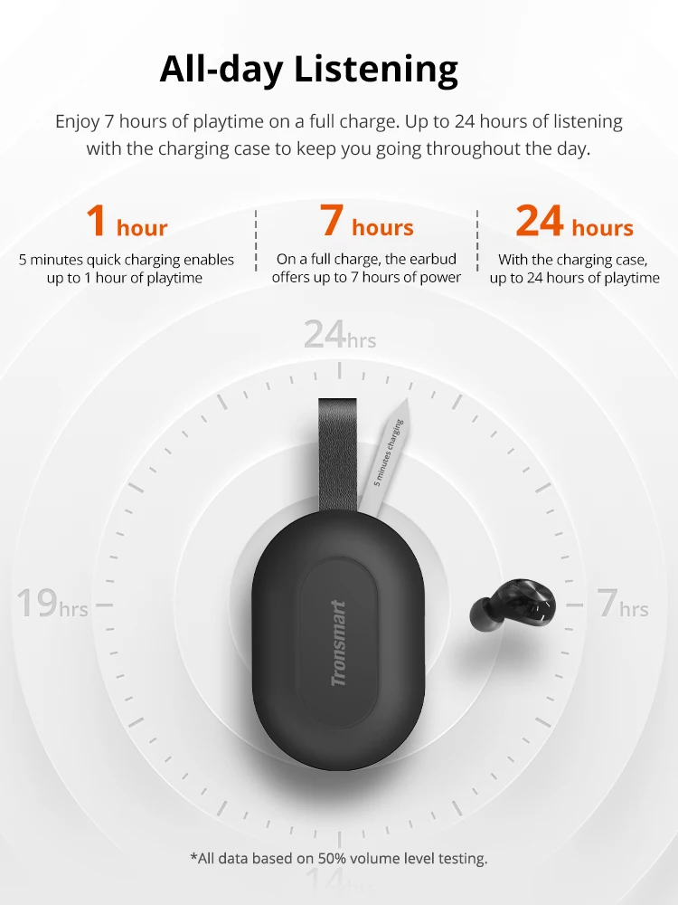 Наслаждайтесь 7 часами воспроизведения при полной зарядке. До 24 часов прослушивания с зарядный чехол для того, чтобы держать вас происходит в течение всего дня. 5 минут быстрой зарядки = до 1 часа воспроизведения * данные основаны на 50% тестировании уровня громкости.