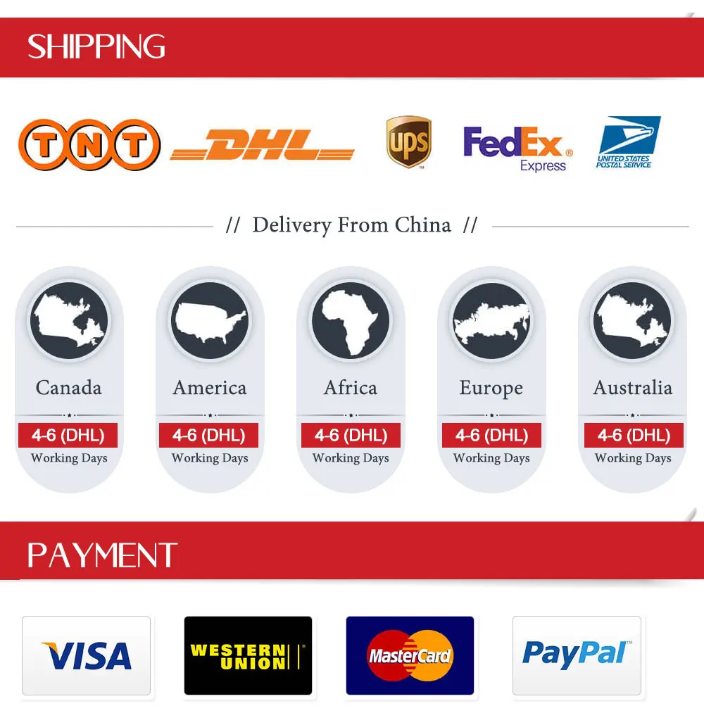 1)Alipay является приемлемым, пожалуйста, не стесняйтесь связаться с нами перед оплатой. 2) Это всегда занимает 3-5 рабочих дней, прежде чем мы можем предложить номер отслеживания, когда автомобиль готов к отправке. 3) товары для доставки отправляются из Китая авиапочтой, доставляются в большинство стран в течение 10-20 рабочих дней. 4) Вы можете выбрать другие способы доставки, такие как UPS, Fedex, DHL, TNT, EMS и т. д. достигайте большинства условий в течение 3-7 рабочих дней. Но покупатель должен оплатить стоимость. 5) Стоимость доставки не включает налоги на импорт или другие дополнительные сборы, и покупатели несут ответственность за таможенные пошлины.