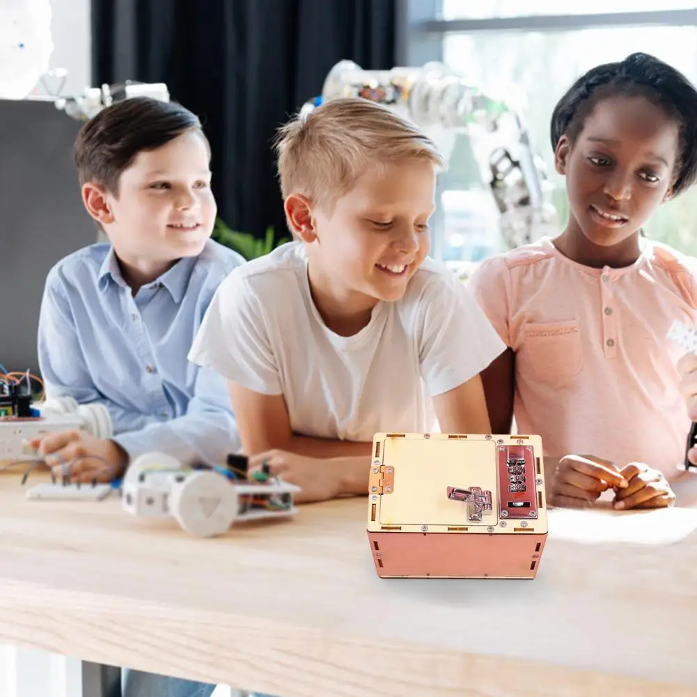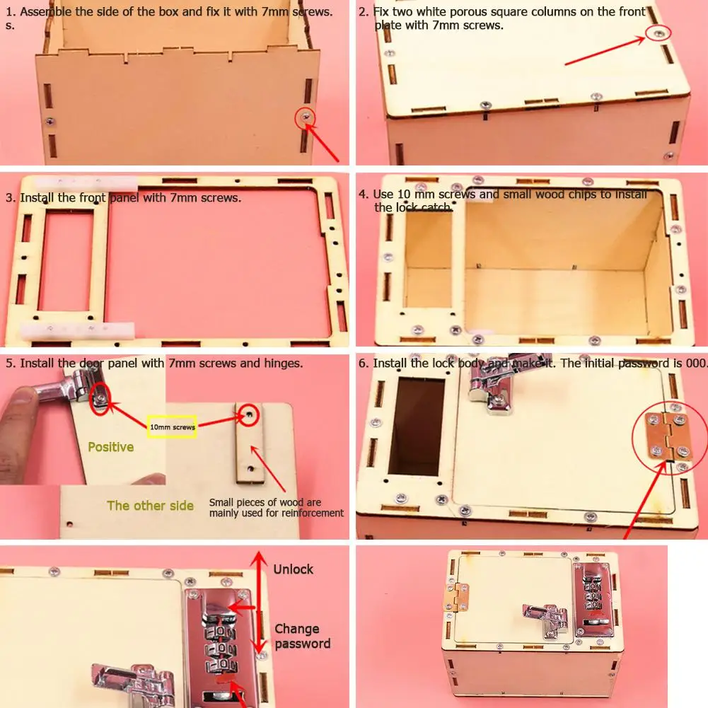 Features:Log color can DIY freely to doodle and create a toy of your own. The initial password of this product is 000. Installation instructions: 1. Assemble the side of the box and fix it with 7mm screws. 2. Fix two white porous square columns on the front plate with 7mm screws. 3. Install the front panel with 7mm screws. 4. Use 10mm screws and small wood chips to install the lock catch. 5. Install the door panel with 7mm screws and hinges. 6. Install the lock body and make it. The initial password is 000. Specification: Material: wood + metal + plastic Size: 13*9*8cm / 5.1*3.5*3.1in Recommended age: over 4 years old Pay Attention: When assembling the products, the red wire connects to the positive pole of the battery box and the blue wire connects to the negative pole of the battery box. All products do not carry batteries; accessories color is random; do not specify the color. Please read carefully before buying. Contains small accessories and sharp objects. Children should be accompanied by adults. Please take care of children and avoid from swallowing. Note: Due to the different monitor and light effect, the actual color of the item might be slightly different from the color showed on the pictures. Thank you! Please allow 1-3cm measuring deviation due to manual measurement. ![]() 1 X DIY Science Experiment Kits