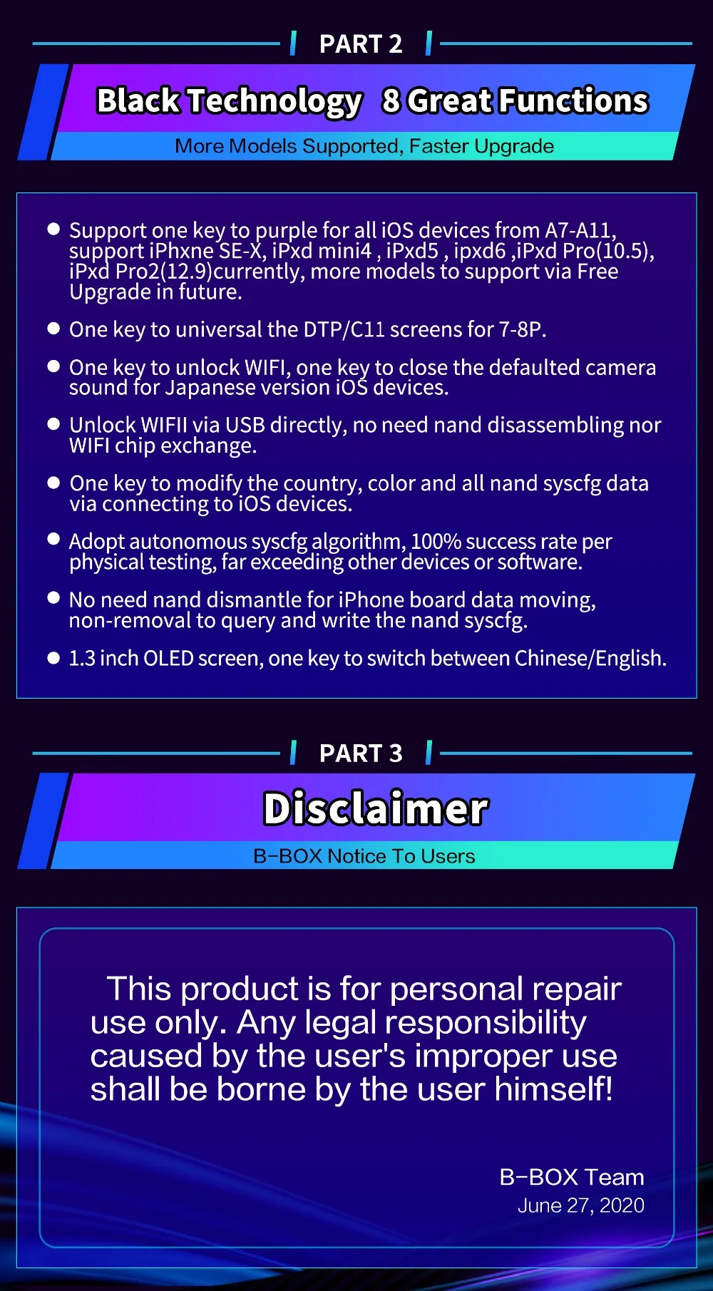 1. B-BOX поддерживает большинство полных моделей для всех устройств iOS от A7-A11, поддержка ipxne SE-X, iPxd mini 4, ipxd 5 / 6, ipxd Pro (10,5), ipxd PRO2 (12,9), iPad 2019 в настоящее время поддерживает больше моделей с помощью бесплатного обновления в будущем.