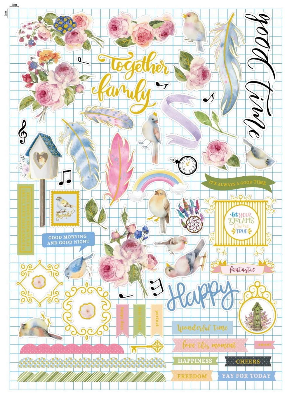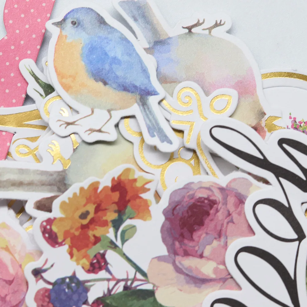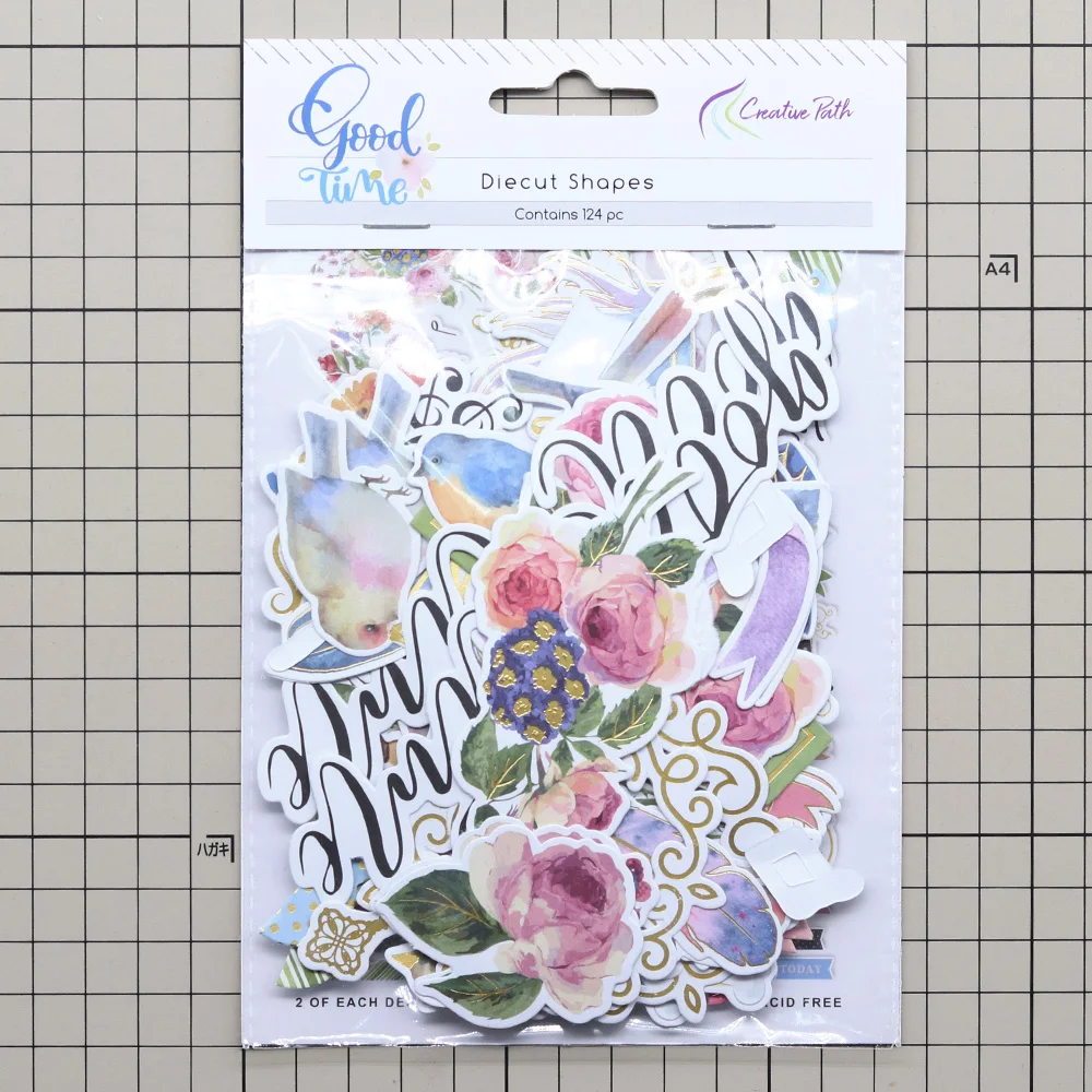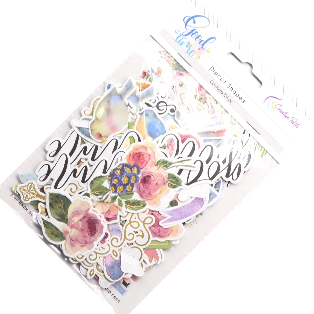 124 бумажных дисков с красивым рисунком, а некоторые-с отделкой фольгой. По 2 штуки каждого дизайна.