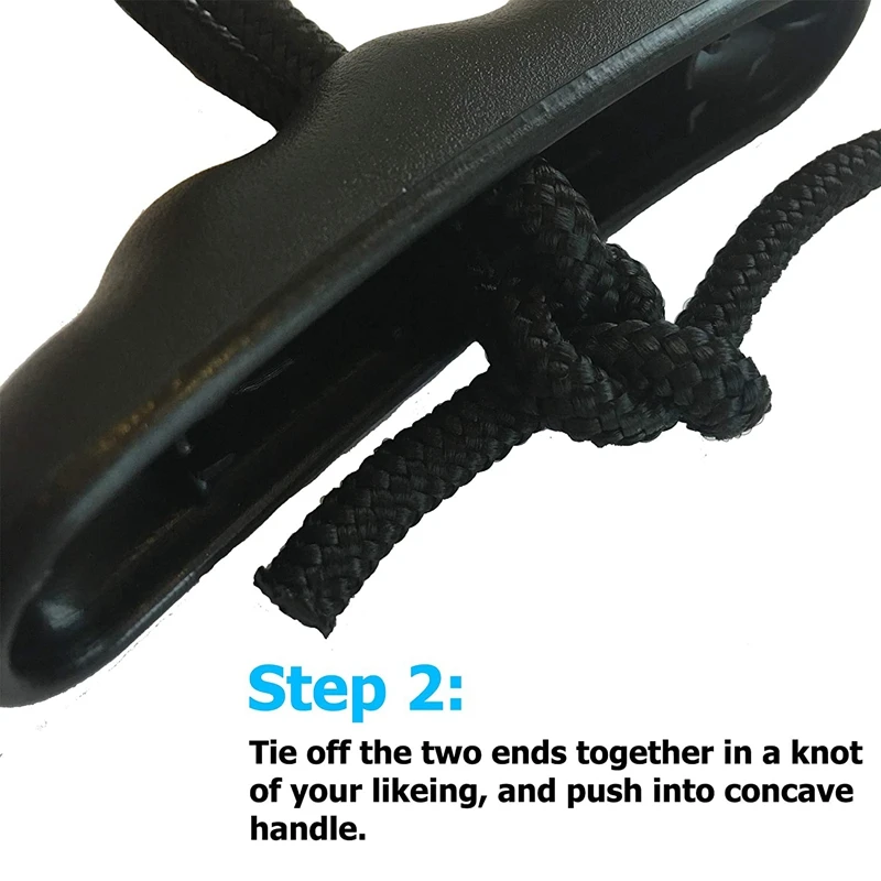 Простая сборка-Положите ручки на каяк за считанные секунды в три простых шага. 1) проведите петлю через место крепления. 2) поместите концы стенда веревки через отверстие в середине ручка для каяка. 3) Завяжите веревку узлом и поместите защитный чехол сверху.
